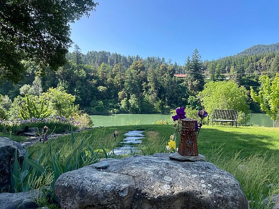 Meander down the stone path deeded river access from this enchanting Craftsman style bungalow, nestled along the Trinty River in sunny Willow Creek. Step through the front door and be impressed by the quality of construction in this beautiful two-story, fully furnished 2 bedroom 1.5 bath home. Lower level has mudroom entry with sink & cabinetry, main bathroom where you can soak in the tub and enjoy the river views and Corian walk-in shower, laundry closet with stacked washer/dryer, closet, and entry to garage, porcelain tile floors. Upper level has open floor plan Kitchen, dining & living area with deck where you will sit & enjoy the river view. 2x6 construction, Milgard windows, metal roof, concrete board siding. Seller to view all offers June 7. All furniture included in sale.Quartz counter tops throughout Hardwood flooring throughout upper level, easy-close wood cabinets. Slate tile woodstove surround, automatic Generac generator, mini split heat/air conditioning, , skylights, cozy window seat on staircase. Every bit of space was utilized in this rare home. Drip system throughout property services the terraced garden beds, fenced orchard area. Developed rock walking bath to the beach & river area. Must see property!