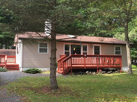 Price Reduced! RANCH on 0.57 Acre CORNER LOT- DOUBLE LOT=1 SET OF DUES&TAXES! Meticulous 3 Bedroom and 1 HUGE Full Bath. A Bright home with a nice Kitchen: stove, refrigerator & microwave, ent. door to side deck. Living Room: huge bay window pouring in sunshine, woodstove, ceiling fan & ent. door to front deck. Newly finished spacious full Bath has ceramic tile floor with Tub&Shower. A Newer Master Bedroom added on for more space. Enjoy the laundry room w/washer&dryer! Freshly painted decks, nice storage shed, large front yard to set up corn hole or horseshoes or volleyball for family time! JUMP ON YOUR GOLF CART, MEET YOUR NEIGHBORS AT THE LAKEFRONT LODGE, SIP COFFEE ON THE LAKEFRONT PAVILION, WORKOUT IN GYM, SHOOT A GAME OF POOL! Own a piece of Pocono Mountains Real Estate=HOME!