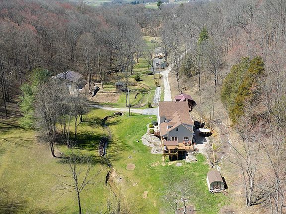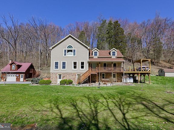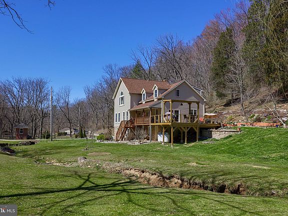 OPEN HOUSE SUNDAY 4/13 from 1-3! AMAZING VIEWS! Journey down a private lane to this gorgeous farmhouse on 8 private acres with a creek, 1600 SF pole building, an oversized attached garage, and a detached garage with 2nd floor living area. Enjoy partially fenced-in pasture, a chicken coop, garden areas, and grape vines, all outside your front door. The interior features wide plank pine flooring throughout. The kitchen and dining area lead to a two-sided deck with serene countryside views. The family room has a wood stove with a brick hearth. A formal living room, an office with French doors, and a powder room complete the main level. The primary suite includes 3 separate closets, a vaulted ceiling, and a large picture window with a half-moon stained-glass window. The primary bathroom has a double vanity, a soaking tub, and a walk-in shower with tile surround. Two additional bedrooms, a full bath, and a laundry room complete the upper level. The lower level has a family room with a half bath, which can be used as extra living space or storage. Located just minutes from the PA/MD line with an easy commute to I-83 and local amenities.