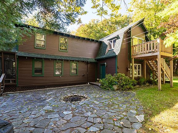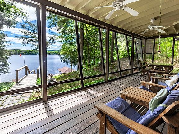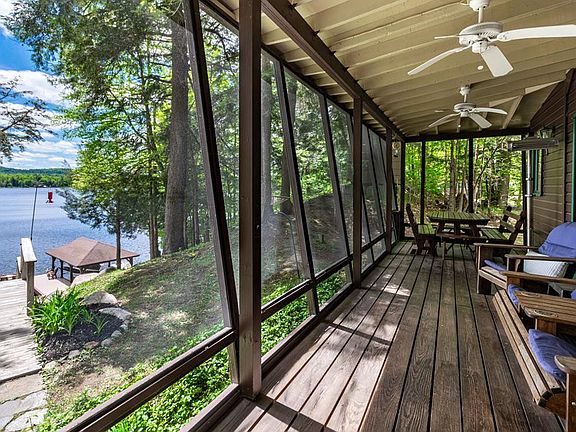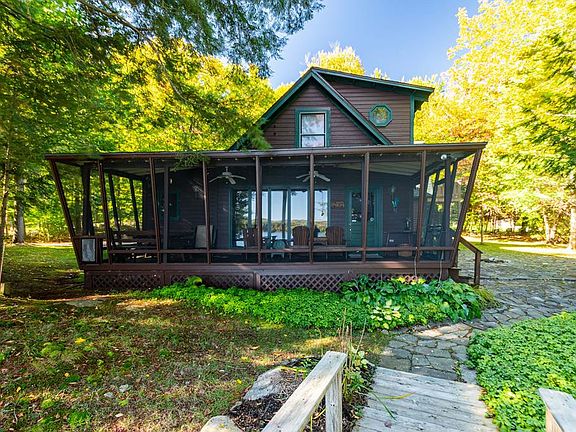You will enjoy beautiful, unobstructed views of Fourth Lake from this historic camp on Ramona Point Road. This charming camp features a large screened-in porch and a stone entertainment area overlooking the water. The living and dining area has views of the lake, a custom, handmade chandelier, and Fir hardwood floors. There is a bedroom and bathroom on the main floor. The second floor offers a bedroom overlooking the lake with a pass-through bedroom or office, a nice updated bathroom, and a spacious room with a second-floor outdoor deck that could serve as additional entertainment space or another bedroom. Stairs lead to a lawn by the water, a storage building, and a beautiful open boathouse with an electric lift and a large dock. This offering includes an oversized single-car garage for storage. Total Taxes $5,825.73