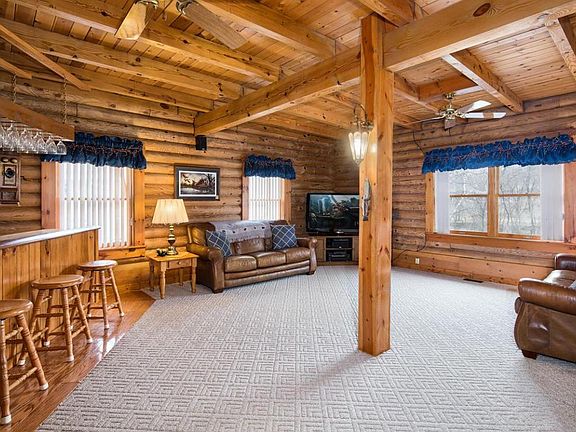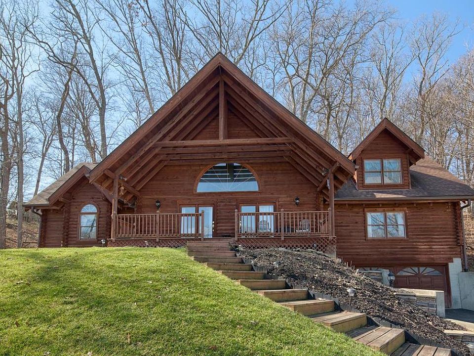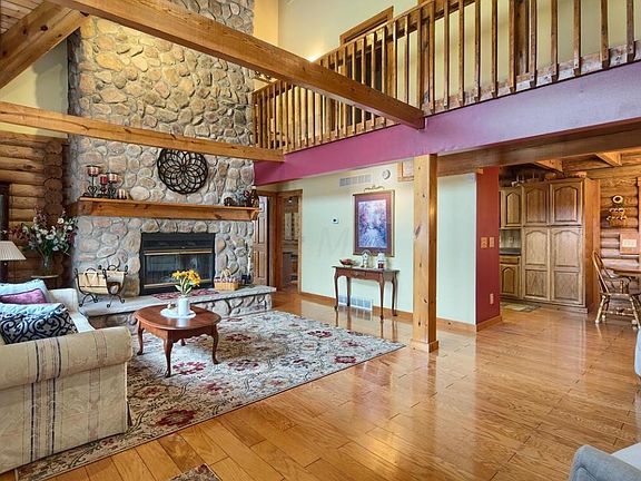 Overlooking Big Darby Creek!! This beautiful log cabin is exceptional. Over 2600 square feet of living space with log interior walls and wood ceilings. Vaulted living space with handsome stone fireplace. Full-sized family room and huge eating area. 1st floor master with loft. 2 bedrooms up with full bath. Great lower level with finished room. 2 car attached garage. Rare opportunity, do not delay!!