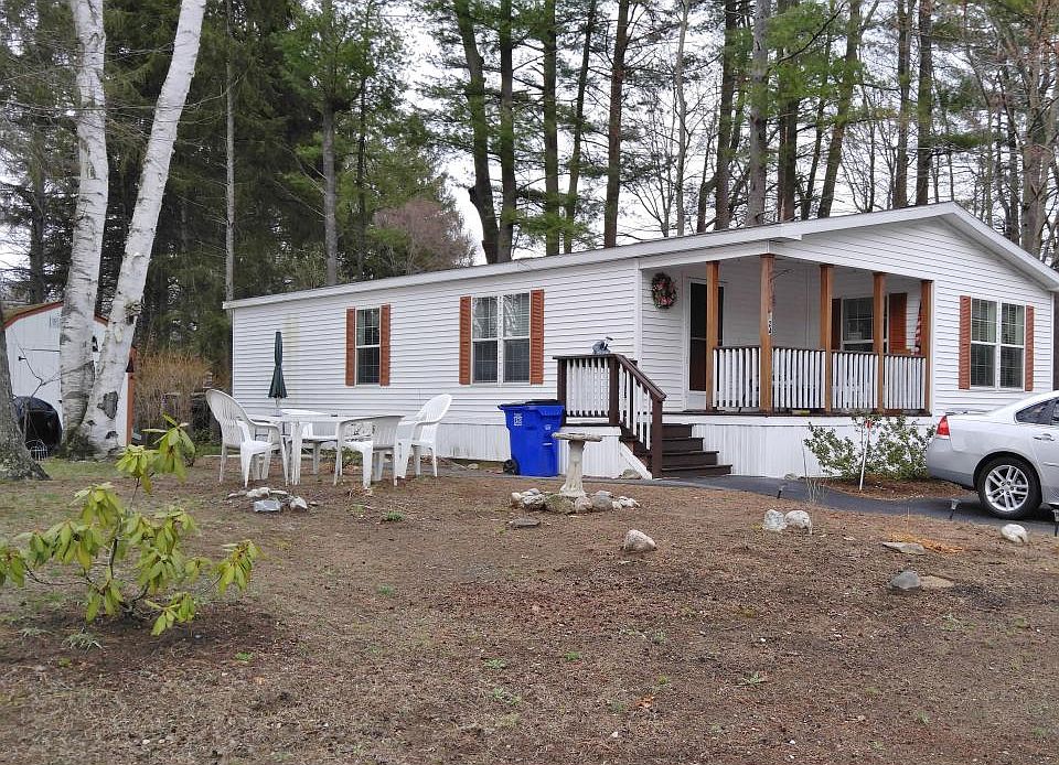 Beautiful Home ready for you to move right in! This home has been well cared for. A large open living / dining area with updated ceiling fan and beautiful chandelier. The spacious kitchen is open to the dining with space to eat at the counter, gas cooking, clean white appliances and tons of cabinetry. You can enjoy the sunshine in the front den/office or on the front covered porch. The master suite is sized for a king bed and additional furniture. There is a generous walk in closet and another closet for linens in the master bath. A step-in shower, tall toilet and tall sink cabinet complete the bath. The second bedroom also has a walk-in closet and plenty of room for your guests. There is an addition full bath and a large utility/laundry/mud room. Outside is a good sized shed, perennial plantings in the garden and a paver patio. This home has a substantial slab and tie-downs. Exeter River landing is a 55+ Age Restricted community. A Small Dog / Cat is permitted.