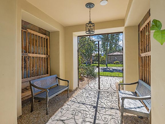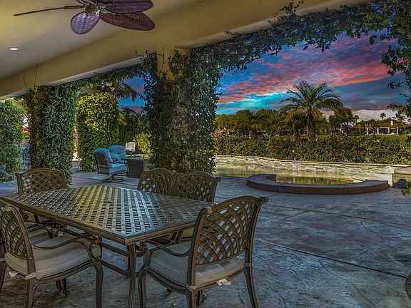 Pristine and Perfect describes this aesthetically appointed home with MASSIVE WATER, MOUNTAIN and GREENBELT VIEWS within, Mission Hills/Legacy-Oakhurst, in the heart of Rancho Mirage! A highly sought after open floorplan with high vaulted ceilings and stunning views of the Chocolate Mountains through walls of glass that flow across the entire great room making this the ideal space for entertaining and relaxing. Your Resort Lifestyle is at it's finest here, with an expansive Veranda providing multiple seating areas, while overlooking the 13th Fairway of the private Pete Dye Golf Course. Offered TURNKEY FURNISHED, with newer designer inspired furnishings AND a GOLF CART! This home features gorgeous travertine flooring throughout, recessed lighting, updated countertops, a wet bar and a beautifully carved limestone fireplace, adding ambiance to the great room. Embrace the Chefs Kitchen with granite counters and backsplash, a breakfast bar, beautiful cabinetry and stainless Kitchen Aide appliances. The Primary Suite has spectacular views with double doors to access the seating area around the outdoor fireplace! A well appointed Primary Bath provides dual vanities, a separate shower, large tub and a huge walk -in closet with plenty of built -ins. Hosting is easy here, with two guest en-suites and a spacious DETACHED Casita with fabulous separation for maximum privacy. Social & Fitness Membership, Cable and front yard landscaping all Included in this HOA! Come Live the Dream!!