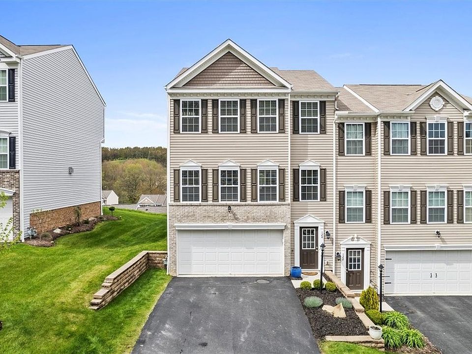 Come home to this stunning 3 BR, 2.5 bath end unit townhome in the desirable Harmony Junction community, conveniently located just outside of Zelienople and close to 79! Light and bright open floor plan with wide plank LVP flooring throughout kitchen and dining area offers expansive views out the sliding doors leading onto the back deck. The kitchen is perfect for entertaining with a large eat-in island, gas stove, and tons of storage. The family room has loads of natural light, a gas fireplace, and lots of space for large furniture. Beautiful crown molding throughout first floor and upgraded window trim finish off this area. The iron railing leads upstairs to an open landing area with three bedrooms. Master bedroom has a walk-in closet and en suite bath with double sinks. Two other bedrooms and the second full bath complete the upstairs. Oversized two car garage offers space for storage. Low maintenance living at its finest with a low HOA fee and an incredible location!