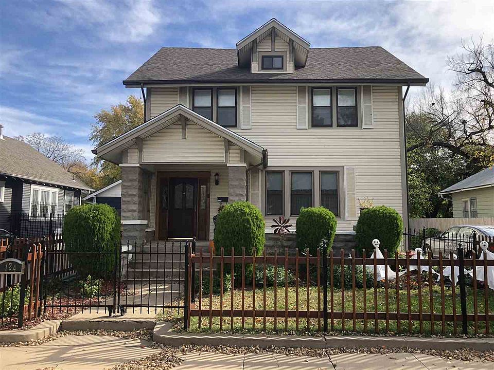 Located in historical Delano neighborhood on peaceful street with mature trees. This traditional Craftsmen home boasts an enormous living with original hardwood floors, crown molding and staircase, built-in cabinetry, gas fireplace and many windows for natural lighting. Updated kitchen with gas stove and pantry. Main floor laundry just off kitchen. Formal dining room with original pocket doors and hardwood floors. Study or library just off dining room. Upstairs with three large bedrooms. Master bedroom has private bath with separate sitting room. Much storage room in basement. Amazing backyard with patio, deck, sprinkler system and pond with waterfall. Oversized 2-car garage with bathroom. House and garage have vinyl siding. Upgraded electric box, replacement windows and kitchen appliances. House has been wired for generator. Beautiful covered front porch! So many extras!