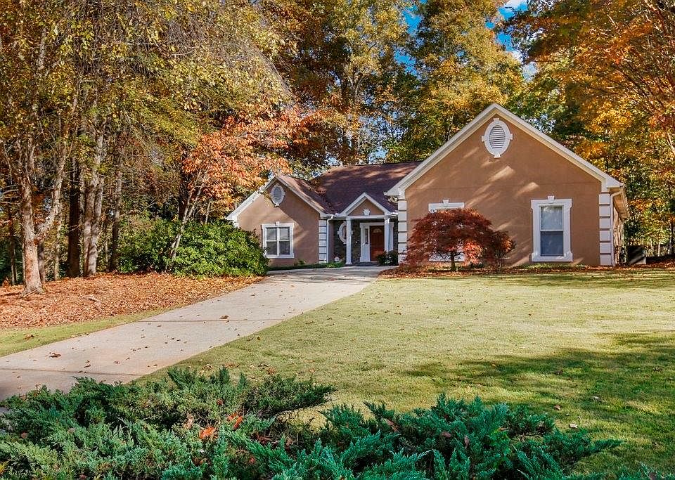 STUNNING European style RANCH home in quiet sought after Pates Lake subdivision . This lovely CUSTOM HOME has 3 spacious bedrooms and 2.5 bathrooms. The wide semi CIRCULAR DRIVEWAY leads up to a 3 car insulated garage. The exterior of this house is pristine, composed of real stucco, which is both beautiful and durable. Enter into the Bright spacious living room with its Vaulted Celling and Hardwood floors for a light and airy feel. The living room is open to the dining room and has a wet bar with a beverage fridge and installed blender for mixing those delicious Cocktails! Great for entertaining! This Well Maintained home is Clean and Bright with loads of Charm, a functional layout, and tons of storage. The primary suite boasts tray ceilings, a large en-suite and sliding glass doors leading to a spacious deck. It provides the utmost privacy separated from the other two bedrooms by the living area. The eat in kitchen has plenty of storage, white cabinets and stainless steel appliances. The Huge deck provides plenty of shade for just relaxing or entertaining your friends. All of the windows are upgraded Pella windows. This Unique home has to be seen! The nominal HOA fee provides Community residents with access to a pool, tennis courts and a playground. It is conveniently located minutes to Interstate 75, Shopping, Tanger Outlet Mall, The Atlanta Motor Speedway and about 1/2 hour from Hartsfield Jackson International Airport. Schedule your tour today!