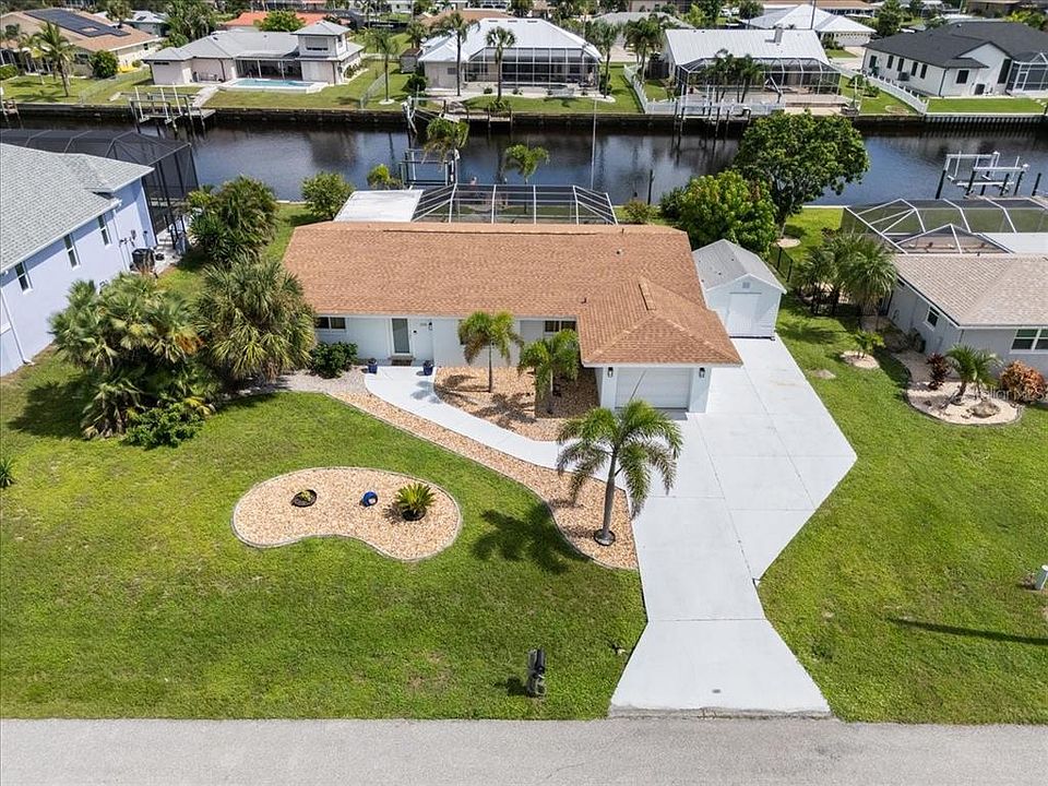 SAILBOAT ACCESS • SWIMMING POOL • FURNISHED Just minutes to open water, this home is a boater’s dream! Inside, the updated kitchen takes center stage with a stunning waterfall island with breakfast bar area, stainless steel appliances, sleek European-style cabinetry, quartz countertops and quartz backsplash. The open-concept living spaces feature designated dining area, new vinyl plank flooring, new interior doors, baseboards, fresh paint (inside and out), new modern light fixtures and a bright, inviting flow—perfect for both everyday living and entertaining. The split floor plan offers privacy, with both bathrooms freshly renovated. Each includes a wall-mounted floating vanity and striking large-format tile and LED mirrors. The primary suite boasts a glass-enclosed shower, while the guest bath showcases a beautifully tiled tub/shower combo with sleek glass doors. Step outside to your private retreat: an expansive screened pool area with a resurfaced pool, brand-new heater, shaded lounging space, and a summer kitchen setup that makes outdoor dining and entertaining easy. A 62x15 driveway addition provides ample parking, and a 10x14 shed adds convenient extra storage. Major updates bring peace of mind, including a NEW roof (2022) and NEW HVAC (2023) and Hurricane IMPACT windows (2025). Offered fully furnished, this property combines style, comfort, and the ultimate waterfront lifestyle. With 100 feet of concrete seawall, a private dock, and a 9,000 lb. boat lift, you’ll enjoy quick access to the harbor and beyond. Plus, Port Charlotte Beach Park is just minutes away, offering volleyball, kayaking, tennis, and a playground for endless outdoor fun.