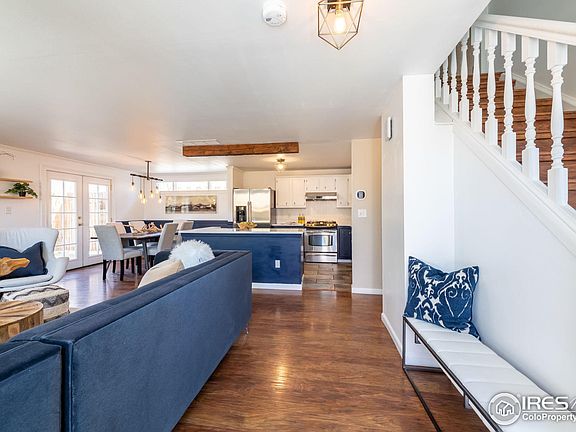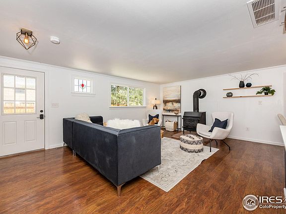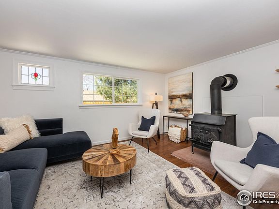 Delightful 4 bedroom Cape Cod style home filled with light and charm. Lush, relaxing yard in a quiet cul-de-sac. Open floorplan with crisp design including clerestory window. Wood laminate flooring, wainscoting, reclaimed beam, cozy wood-burning stove, and modern lighting. Beautifully remodeled kitchen w/gorgeous quartz countertops, Kraus under mount sink & faucet, stainless appliances, gas range w/new Hauslane exhaust hood, navy and white cabinets with brass pulls. The kitchen opens to the pleasant dining room with French doors to the private rear deck. Nice layout with two large bedrooms and full bath on the main floor plus two larger bedrooms with built-in storage, plus a second full bathroom upstairs. Main level laundry with front loading washer & dryer included. The yard is a serene retreat from the moment you enter through the inviting vine-arbor-covered gate. An expansive patio provides perfect outdoor living overlooking the grassy yard with mature trees, including 3 delicious, sweet apple producing trees and 3 raised garden beds. The fire pit makes for a great gathering spot. New red cedar fencing on the West and North sides provides privacy and a sharp, clean look. Other improvements included a new Ecobee thermostat, oil-rubbed bronze door knobs throughout, fresh interior paint, 2020 new insulation, and 2017 new furnace. The oversized one-car garage has room for all your gear. Excellent location, just 3 houses from the pathway to the Oligarchy Ditch Trail to Clark Centennial Park and beyond. Easy access to Main Street shopping and dining. Welcome to this wonderful home!