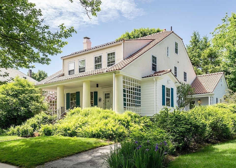Beautiful four-bedroom Spanish Colonial in one of West Roxbury’s most coveted neighborhoods. This stunning stucco home with its terracotta tiled roof sits atop exquisite landscaped grounds on double lot. London Planetrees line the street, creating a glorious tree canopy. Expansive covered front porch with broad columns and side trellises enhances curb appeal. Elegant foyer opens to library and to living room with woodburning brick fireplace and pocket doors that lead to formal dining room. Modern eat-in kitchen with granite counters and custom cabinets opens to family room with large transom windows. Primary suite features walk-in closet, laundry room, private porch, and luxurious bath with marble flooring, double vanity, soaking tub and spa shower. Side entry offers tiled mudroom with built-ins, window bench and modern half bath. Glass doors lead to screened porch, bluestone patio and gorgeous yard ideal for entertaining and relaxing. Walk to commuter station, shops and restaurants.