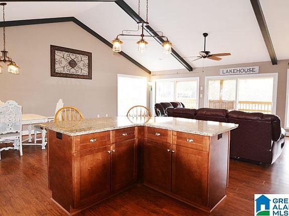 ONE LEVEL Living on LOGAN MARTIN LAKE! OPEN Floor Plan ~ Almost New/Home approx. 2 years Old ~ Cathedral Ceiling with Exposed Beams ~ Glass Doors across the rear of the home to maximize the lake view. Large COVERED Porch off Great Room ~ Kitchen features GRANITE ~ STAINLESS ~ BAR that surrounds Kitchen ~ Great Home for Entertaining ~ Recently added MASTER Bedroom SUITE & Master Bath ~ View from the Master Bedroom is stunning. Shiplap Wall in Master ~ Beautiful Free Standing Soaker Tub/Large Shower with Herringbone Subway Tile ~ This home features the updated colors including White Tile etc...TANKLESS Hot Water ~ Spray Foam Insulation inside the addition. ~ New Boathouse with Boat Slip/Lift/Seadoo Lifts/Poured Sea Wall/Large Raised Patio for Outdoor Entertaining(Perfect spot for outdoor fireplace.) Approximately 135 of Shoreline ~ Spotless & Move In Ready at the end of a dead end street.