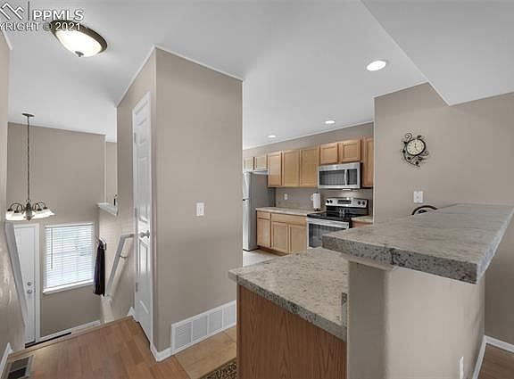 Well taken care of Palmer Lake Townhouse with gorgeous mountain views in a peaceful setting. Conveniently located right off Highway 105 with quick access to I-25 to make your way toward Colorado Springs or Denver! If you love nature, parks, and the lake, this home is just minutes from Palmer Lake and the beauty and fun it offers! It is totally move in ready, clean, updated with New Flooring, Baseboards, Lighting, Sinks, Faucets, Vanities, Toilets, Shower Doors, Kitchen Cabinets, Cement Countertops, & Stainless Steel appliances, Kitchen counter extended, Fresh Paint, and Modern Bathrooms! Roomy eat-in Diningroom/Kitchen with a Breakfast Bar and Pantry! Main level Living Room with Gas Fireplace and Walkout to the backyard with a beautiful view of the mountain ranges. Nice and sturdy Screen Doors both front and back. Master bedroom with adjoining bath and an additional bedroom is upstairs. A third bedroom with adjoining bath in the basement. An attached one car garage with shelving for extra storage, a fairly new garage door and new opener. Fence has been weather-proofed, security on all doors and lower windows. An amazing location, breath-taking views, close to trails, open space, shops, and dining in Villa Restaurant or visit the Tri Lake Center for the Arts. Close to the Santa Fe Regional Trail for a nice hike or biking opportunity all the way to downtown Colorado Springs! Watch the Fireworks from your own backyard!