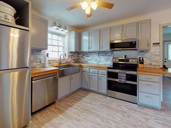This cute as a button rambler has been remodeled top to bottom! Laminate wood floors throughout, all new light fixtures and new paint . Kitchen features SS appliances, stone backsplash and butcher block countertops. Laundry conveniently located in kitchen. 3 year old HVAC. Luxurious master bath with fully tiled walk-in-shower. Relax in the beautiful yard, complete with deck and brick patio , raised flower beds and 2 sheds for your storage needs.