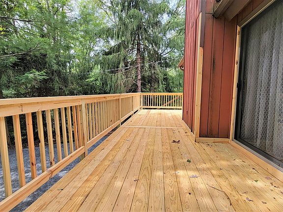 Privacy abound! Set on over 1 Acre. Come see to appreciate the private setting of this home surrounded by forest and set back nicely from the road. This 3 bedroom 2 full bath home features stone faced wood burning fireplace in living room, propane stove in walk out basement, lots of glass makes for bright home though out, large enclosed porch overlooking beautiful forest land, new open deck the length of the house, and hardwood floors.
