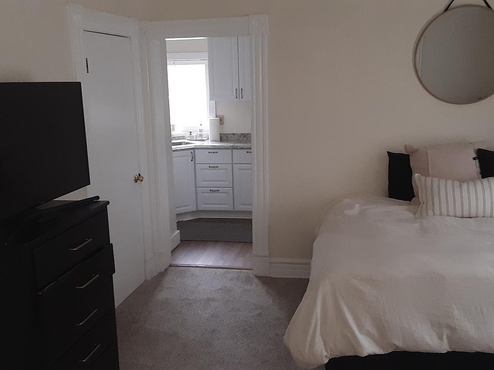 Freshly painted 2nd floor apartment with new appliances and carpet. 1 bedroom, 1 bath with Private 2nd floor deck/balcony. About 450 square feet. Owner pays water, sewer, trash, gas and electricity. No pets, no smoking. Street parking. First months rent and security deposit due upon lease signing. Parking is on Street.