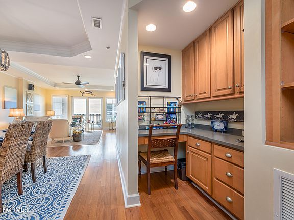 Check out this immaculate luxurious 2 Bedroom/2 Bath condo with deeded covered gated parking space is within steps to Historic Downtown, Riverwalk, restaurants, shopping, & museums. This inviting open concept split floor plan features a gourmet kitchen w/ granite countertops/stainless steel appliances/pantry/high bar overlooking the dining room and computer workstation nook w/ cabinetry and built ins. The spacious living room leads out to your covered terrace where you can relax and enjoy the Carolina sunsets and sweeping city views. The owners suite features trey ceiling, walk-in closet, & en suite bathroom w/ dual vanities, soaking tub, & tiled walk-in shower. The guest bathroom features an expansive countertop, tiled tub/shower combo. The cozy guest bedroom has crown molding. There are trey ceilings, canned lighting, crown molding, wood flooring throughout the primary living areas. There is also a storage closet adjacent to the unit. HOA amenities include coded entry into the building, doorman M-F, elevator, dog run, cable, water, sewer, master insurance, exterior maintenance, common area maintenance. Schedule your showing today! The HOA does not permit Airbnb rentals.