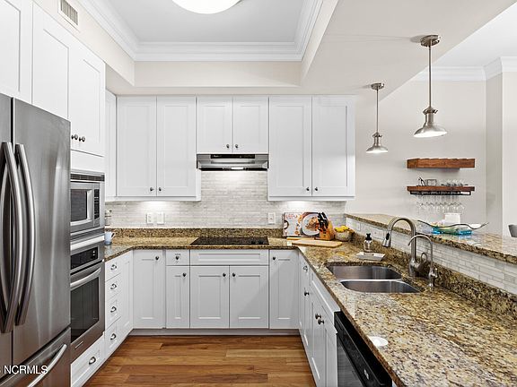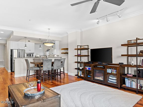 This immaculate condo offers a balcony with sunset views of the Cape Fear River and features a master bedroom with ensuite, additional office/den with closet, a second hall bathroom, and a deeded, gated garage space. The inviting open-concept floorplan features a gourmet kitchen with granite countertops, tile backsplash, pantry, and bartop that overlooks the dining area and living room. Freshly painted, this condo also features gorgeous hardwood floors, 6-panel doors, crown molding, iWave air purifier HVAC system, reverse osmosis drinking water system, Hunter Douglas Duet window treatments, and canned lighting. Equipped with a LG washer and dryer and all stainless-steel kitchen appliances. Conveniently-located locked storage room for belongings and seasonal items. HOA amenities include coded/fobbed building entry, weekday doorman, elevator, dog run, cable with Internet, water, sewer, master insurance, exterior maintenance, and common area maintenance. Located in the heart of Historic Downtown, surrounded by restaurants, shops, parks, museums, and The Riverwalk.