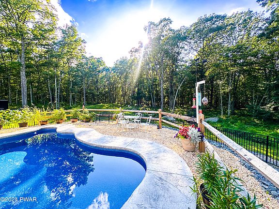 EXTRAORDINARY OPPORTUNITY FOR THIS EXTRA-SPECIAL RANCH HOME HAVEN!!A rare sale in the highly exclusive neighborhood of Blue Heron Woods, offering the perfect combination of modern accommodations & natural beauty. Nestled on 2 private acres & only 3 years NEW, this stunning 4-bedroom, 3-bath custom unique retreat offers a complete blend of luxury, comfort, & privacy all on 1-level living! Beginning w/ your own SALT WATER HEATED POOL, surrounded by the loveliest landscape, privately fenced, expanded by lush green rolling yard space, & backing to 2000+ acres of State Game Lands... Your own piece of paradise starts here! One step up the patio takes you to the next level of relaxation or entertainer's bliss w/ spacious seating & lounge areas, BBQ space, a 6-PERSON SPA HOT TUB, & outdoor TV! Once inside, you'll feel welcomed right home to a gorgeous light & bright, window-filled open floor plan stretching from end to end of this supremely designed space. Interior features incl. very generously laid out living & dining areas, beds, baths, tremendous full square walls of cabinetry, stainless & black granite kitchen w/ double wall oven, 6-burner gas cooktop, eat-in breakfast area & additional breakfast bar overlooking the beautiful rustic yet modern living rm showcasing the massive floor to ceiling stone FP & sliding barn door leading to dedicated office space w/ views of the front porch, flowers, & expansive front yard. Oversized 3BR's + stunning spacious primary suite w/ more windows galore, sliding door access to the back patio oasis, & HUGE primary wash & dressing rm complete w/ luxurious floor to ceiling tile walk-in shower w/ built-in bench seat, walk-in closet & private toilet room. Enormous full BSMT ready to be finished to your liking & design AND attached overized 3-car gar. w/ add'l storage space. This home is move in ready for it's new owners!