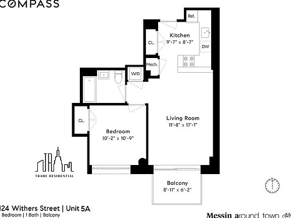 Step into the Williamsburg lifestyle with this pristine, sun-drenched, south-facing 1-bedroom apartment at 124 Withers Street. Just moments from the Graham Ave L stop and the lively McCarren Park, this home offers both convenience and charm in the heart of one of Brooklyn's most vibrant neighborhoods. The standout feature of this apartment is its oversized private balcony, perfect for al fresco dining or relaxing with plenty of space for outdoor seating. Inside, you'll find modern amenities including brand-new appliances, hardwood floors, air conditioning, an in-unit washer/dryer, and a dishwasher. The kitchen is designed for both function and style with a vented stove hood, a refrigerator featuring a freezer and chill drawer, and a raised island counter ideal for bar seating. Oversized bedroom windows and a floor-to-ceiling sliding glass door flood the apartment with natural light, creating a bright and inviting space. Ample storage is available with generous closet space in the foyer, living room, and bedroom. 124 Withers Street is a newly constructed luxury rental building featuring a range of amenities, including a beautifully landscaped lobby garden, onsite parking (available for an additional fee), bike storage, and a common roof deck with stunning city views. The building also includes a modern intercom system, key fob entry, and an onsite superintendent. With easy access to Manhattan and a location at the center of Williamsburg's creative energy, 124 Withers Street offers the perfect mix of luxury and lifestyle.