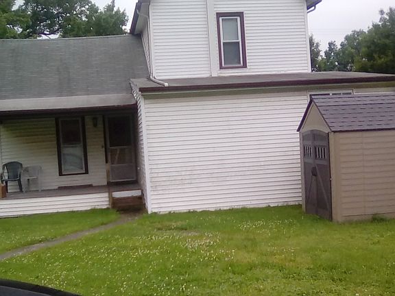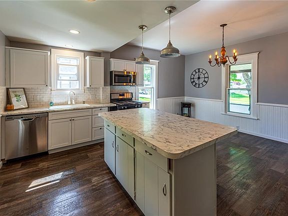 This totally renovated 4 bedroom home with huge 5-6 car garage is a must see!! First floor houses 2 bedrooms, living room, full bath, laundry room and spacious, bright and open brand new fully applianced kitchen with island. Second floor holds 2 additional bedrooms with gorgeous hardwood floors and a large attic (listed under other in room sizes) beckoning to be turned into a master closet. The charm continues outside with covered front and back porches. For the car enthusiast a tandem garage with functioning doors on both ends, electric and floor drains designed and built to store a large RV, truck, camper or boat. High efficiency gas furnace and central air (2020), newer vinyl siding, electric panel and wiring. Full basement offers additional storage and shower.