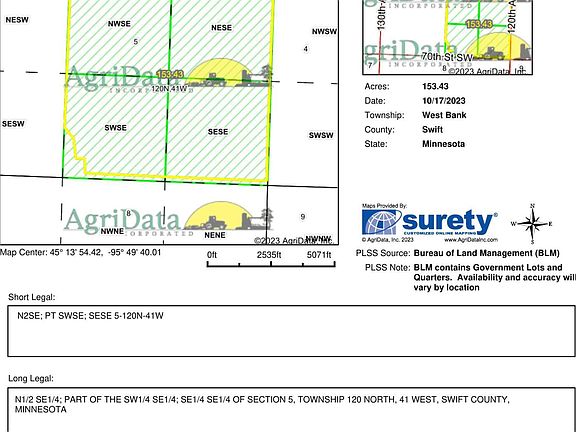 Great opportunity to purchase 160 Deeded Acres (153.43 tillable) of Prime Swift County farmland. Will be accepting offers until November 8th, 2023. Closing date to be January 2nd, 2024 - as land lease will be completed by then.