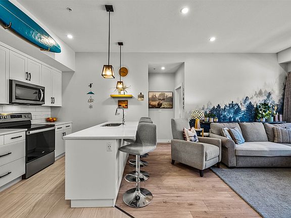 GST and Pillow Tax n/a. Experience modern comfort in this stunning 2-bed, 2-bath condo, with homeowner's warranty. Featuring a bespoke airbrush mural by a local artist, this property offers unique charm and style, with upgraded floor heating in kitchen and bathrooms. Enjoy the convenience of two parking stalls and an open concept, bright, airy living area overlooking Morrisey Mntn. The primary bedroom includes a walk-through closet leading to a luxurious 4-piece ensuite. The spacious open-plan kitchen features ample cabinetry, stainless steel appliances and direct access to a fully fenced triple-width outdoor patio, ideal for pets and outdoor living with hot tub hookup installed. The property includes a large, double wide storage locker for all your recreational gear. Perfectly situated with ski-in/ski-out from the Burfield Chairlift, and seconds away from the Peaks West commercial amenities including a bar/restaurant, Deli, general store, and pharmacy. Short-term rentals allowed. Offered furnished.