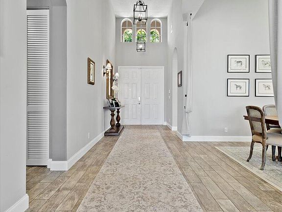 Welcome to Bay View Way! This designer renovated, western facing lake view pool home offers an abundance of natural light throughout, vaulted 15 foot ceilings and spacious floor plan. Newer AC, hot water heater & pool pump. All new porcelain tile floors! Layout consists of a split floor plan ,3 bedrooms plus a den/office that can be a 4h bedroom and 2.5 baths. Laundry room inside with sink leads you the oversized 3 car garage. Multiple living spaces with gorgeous views & a custom chefs kitchen with gas range, Brazilian quartzite countertops, pantry & island. A fully fenced in yard lined with lush foliage and blooming bushes for the perfect way to end your days. Conveniently located on SR 7 close to dining, A+ rated schools, shopping & equestrian facilities. A must see!