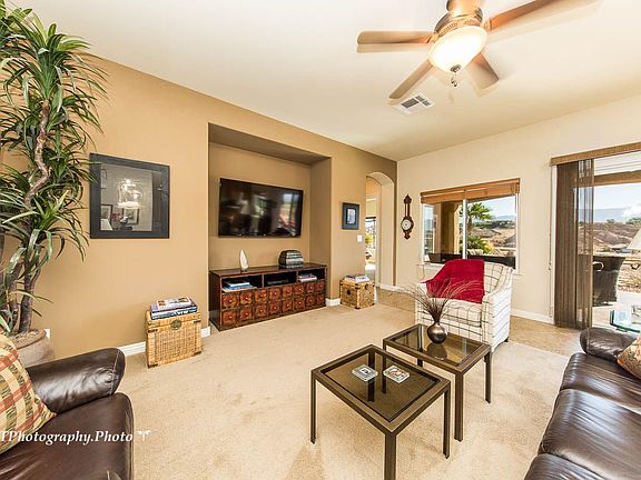 This exceptional home has incredible views of the prestigious Canyons Golf Course located at the Oasis Country Club, colorful mountains and rare views of the world renowned Wolf Creek Fairways. The Eastern orientation is ideal and the courtyard is both cozy and inviting. Everyone loves this split bedroom plan which includes two exceptionally large master suites with walk in closets and attached bathrooms. Fine living at its best, enjoy the spectacular views while entertaining on the custom designed extended patio with an outdoor patio heater and outdoor ceiling fans. This beautiful home has stainless steel appliances with exquisite cabinetry and hardware, Levelor window treatments throughout, gorgeous diagonal tile, ceiling fans with Lutron speed controls, increased ceiling insulation in home and in the 3 car garage! Lets not forget the gorgeous NEW kitchen granite! This home has more extras to see, DON"T MISS OUT ON THIS FABULOUS HOME!!! Come for a day stay for a lifetime!