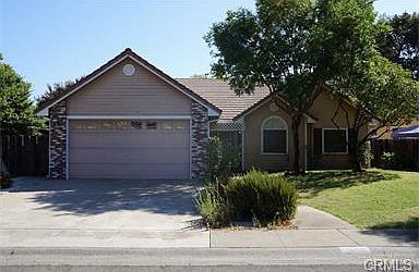 Rare home in desirable neighborhood of Gridley. Elegant features attract the eye such as brick lined exterior and Spanish style composition tile roof. Enter into this spacious 3 bedroom home and be welcomed by cathedral vaulted ceilings, gas log fireplace, and large bright windows. Turn the corner into the large kitchen, ready to entertain family and friends around the central island and eat-in dining space. Plenty of storage with pull-out pan drawers and lots of cabinets. Down the hall sits three bedrooms, including the master suite. Enter the double doors to the master bedroom with architectural window, private exit to rear patio, and spacious bathroom with double sinks, skylight, and walk-in closet. Large walk-in shower features a porthole window for extra light. The third bedroom was used as an office, and has built in shelves and a desk. The rear yard is fully fenced and features a covered cement patio and gazebo. Grapes line the side walkway in back.