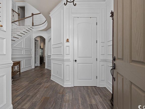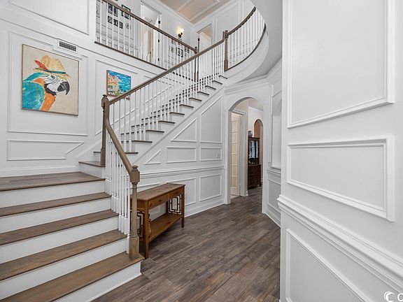 Welcome to a true custom home in Waterbridge with a temperature controlled saltwater pool! This immaculate home features 4 bedrooms and 3.5 bathrooms with a home office. The moment you walk through the door you will notice the exquisite foyer and the grand staircase. This home is full of upgrades including extensive wainscoting, arched entryways, bullnose corners, porcelain tile floors, custom maple cabinetry throughout the entire house, crown molding and attic storage. The spacious, primary bedroom on the first floor features a beautiful tray ceiling and a large en-suite with a garden soaking tub, tile shower, granite countertops and a large walk-in closet. The living room features a beautiful coffered ceiling adjacent to the dining room and spacious kitchen. The large porch with EZ breeze windows overlooking the fenced yard and saltwater pool with built-in lounger decks is perfect for entertaining. Upstairs, you will find a junior primary suite complete with its own bathroom, two additional bedrooms and a guest bathroom. Waterbridge is a sought-after gated community in the heart of Carolina Forest. The community features world-class amenities with a clubhouse, resort-style pool, fitness center, fire pits, bocce ball, sand volleyball, and tennis courts. The 60-acre Palmetto Lake is perfect for kayaking around this gorgeous community. This location provides easy access to restaurants, shopping and the beautiful Atlantic Ocean!