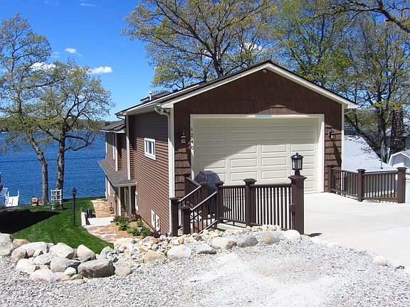 Lone Tree Point lakefront home with concrete seawall, lakeside patio, maintenance free pier, sunset views and a fantastic beach! This home was completely updated and shows like new. Hardwood floors throughout most of the home with tile in the bathrooms & laundry room, and carpet in the bedrooms. Open concept living room, kitchen and dining area leads to an enclosed lakeside porch with Simco windows. A great spot to enjoy the lake breeze and far reaching views. The kitchen has an island, breakfast bar, granite counter tops, tile back splash, stainless appliances and a large walk in pantry. The main level master suite has his and her vanities, a custom tile walk in shower and a large walk in closet with organizers. Upstairs you'll find a full bathroom, 2 guest bedrooms and a den/office. Upstairs also leads to the garage, workshop and a mechanical room. The basement is finished with a family room and a 2nd mechanical room. New siding and roof in 2014. The landscape was updated and is irrigated. Flagstone walkways with slab stone steps were also added. Most furniture and furnishings can be purchased outside the sale of real estate. Some exclusions apply. Boatlift, 2005 22.5 Ft Bennington with 2016 Yamaha 115 hp motor available to purchase outside the sale of real estate.