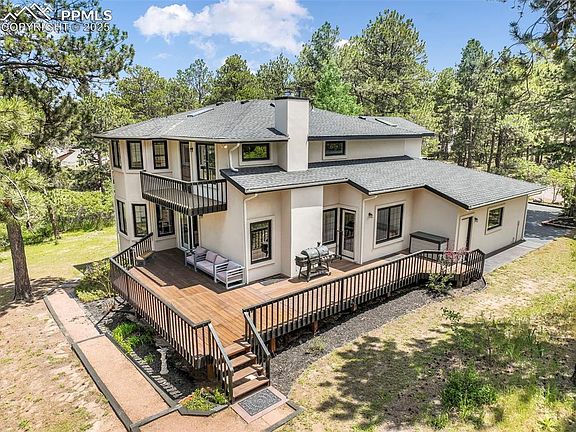 Welcome to your dream home in the heart of the highly desirable Woodmoor community. This beautiful two story home offers space, functionality, and natural charm on a sprawling .9 acre lot. The adjacent treed parcel is also available for purchase! Step inside and feel immediately at home. The main level features hardwood floors throughout the family room, dining areas, kitchen, and living room, where a striking floor to ceiling stone fireplace adds cozy elegance. The kitchen is spacious and features stainless steel appliances, a gas range, double oven, prep sink, pantry, and a large island. Ask about updated kitchen cabinets! The open concept flow from kitchen to dining areas to living spaces makes hosting effortless. Multiple access points to the expansive wraparound deck invite indoor-outdoor living. A dedicated dining room, powder room, and an office with built in bookshelves round out the main level. Upstairs, the spacious primary suite has a private balcony overlooking the backyard, a five piece en suite bath, and a generous walk-in closet. Two additional upper bedrooms share a full hall bath, providing flexible space for family or guests. The finished walkout basement offers even more to love with two additional bedrooms, a ¾ bathroom, a large rec room, and a second family room, perfect for game nights or cozy movie marathons. A newly finished second kitchen with LVP flooring, refrigerator, dishwasher, and hot plate adds exceptional convenience, whether you're hosting extended family or dreaming of multi-generational living. The oversized laundry area provides additional storage and functionality. Outdoor living is just as impressive. Recent professional deck work, sanding, staining and refreshed landscaping enhances the natural beauty of the wooded lot. The three car attached garage gives you plenty of room for vehicles and gear. Enjoy the peace and charm of this lovingly maintained home and imagine the possibilities with the neighboring lot also available!