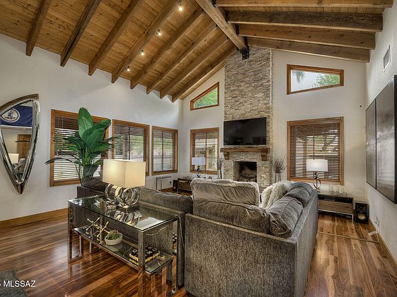 Truly one-of-a-kind contemporary home, built in 2001, nestled in the historic Arizona Inn neighborhood--just one block east of Banner University Hospital. Crafted with exceptional quality and meticulous attention to detail, this private, fully walled midtown sanctuary invites you in through a charming, gated entrance. Enjoy wraparound porches, a sparkling pool and hot tub, a 2,038 sq. ft. main residence with 3 bedrooms, and a 362 sq. ft. guest house your visitors may never want to leave. Step inside the main home to soaring cathedral ceilings with exposed beams, a cozy fireplace, and stunning African teak wood flooring. The gourmet kitchen is a chef's dream--featuring granite countertops, stainless steel appliances, a center island with breakfast bar, scored & colored concrete flooring, and custom cherry wood cabinetry. Additional highlights include wood-framed windows with custom coverings, and a guest house equipped with a new mini-split HVAC system, ideal for comfort and privacy. Enjoy the ease of modern living with recent Smart Home upgrades including a Ring security system, Nest thermostat, Yale Smart lock, Chamberlain myQ Smart Garage control, and Pentair remote pool/spa operation. The home also features a Sonos indoor/outdoor whole-house audio system and a Tesla wall charger in the garage. Live just steps from the Arizona Inn, and minutes to the U of A, shopping, dining, and entertainment. If you're looking for quality, charm, and unbeatable location, this home is a rare gem. Ask about the option to purchase furnishings via separate bill of sale.