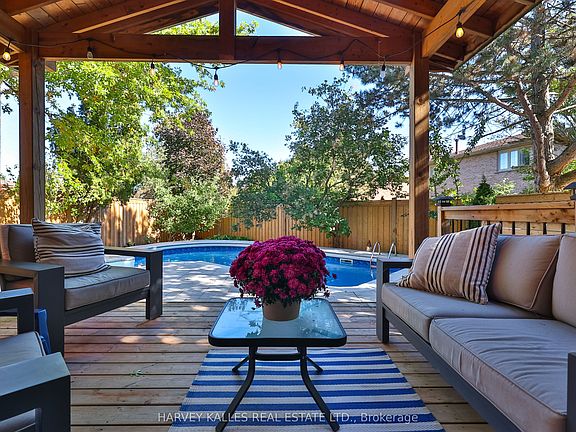 Executive Glen Abbey home, situated on highly sought after Rosethorne Road and elegantly appointed with numerous upgrades and features. Beautiful flagstone entrance and wrapped in modern pavers w/ wide access to backyard. Entrance foyer has tall ceilings and ample natural light. Classic baseboard/trim and immaculate hardwood flooring throughout. Main level Laundry room expertly tiled with great storage space. Spacious main level with the help from pot lights and windows throughout. Exceptionally upgraded kitchen and top quality appliances. Open concept family/kitchen area w/ walkout to backyard retreat, large pool and modern stone clad pool patio. (Heaters 2 yrs. Pump 1 yrs.) 4 Large bedrooms featuring the same hardwood throughout. Primary bedroom features 2 mirrored closets and walk-in closet w/ organizers. Upgraded bathrooms tastefully designed and well executed. Finished basement equipped with den, 3 piece bath and tons of storage space. Great location in an established neighborhood close to highways, shopping trails.