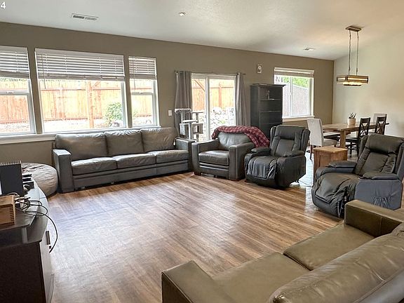 Free Electricity? Stretch Out in this 3-Bedroom/2-Bath Floorplan with the Kitchen, Living Room & Dining Room all Included in the 860+ sqft Great Room Concept Living Area! Vaulted with Luxury Vinyl Planking and a Slider to the 16' x 12' Patio, this Area Provides Plenty of Space for Tranquility or Entertaining! The Kitchen is a Cook's Dream and Boasts Self-Closing Natural Wood Cabinets, Lighted Pantry, Quarts Countertops, Stainless Steele Undermounted Sink & Appliances, Built-In Microwave & a Grand Eating Bar/Island! 14' X 12' Primary Bedroom has 8' X 7' Walk-In Closet and an En-Suite Bath with a Tiled Walk-In Shower, Quartz Counters, Double Sinks and Built-In Linen Cabinets! Barn-Style Door to the inside Laundry Room! High Efficiency appliances plus Gas Forced Air Heating with Air Conditioning! Solar System produces over 1000kwh/month. That's more than the average Oregon Home (975kwh) according to Energysage.com. The Lot is Nearly a Quarter-Acre (.24) with Underground Sprinklers, a Fenced Backyard with Garden Area all on a Low-Traffic Cul-De-Sac Style Circular Street! See The 3-D Virtual Tour!