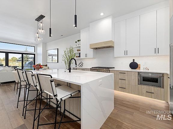 Situated on the picturesque shores of the community lake, this home boasts striking contemporary design with clean lines and high-end materials. Luxurious features throughout, including custom cabinetry and built-in Thermador appliances. The private, enclosed entry patio and second-story deck are perfect for relaxation and entertaining, and command panoramic vistas of the Boise foothills and 25-acre recreational lake. This home is in the mixed-use community of Eagle Lakes. Enjoy fine dining, salons, and coffee just steps away from your front door, as well as easy access to the green belt and Boise River, ideal for outdoor enthusiasts. Experience the perfect blend of modern luxury and natural beauty in this exceptional lakefront home. Don't miss the opportunity to live in one of the most sought-after communities in the Eagle area.