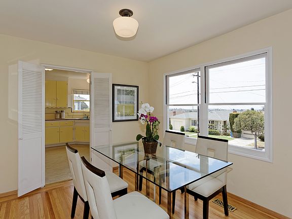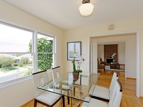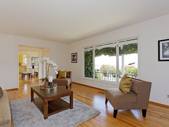 Wonderful home, owned by the same family for over 50 years! Sweet bay views from the kitchen, dining and living room. 3 beds and 1 bath upstairs, 2 plus rooms and a bath downstairs. Tranquil backyard with grass, play area, patio, and hidden garden- a gem! Near parks + BART, zoned for Madera. Open Sunday 8/2 + 8/9.