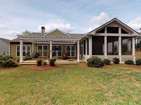 Sought after Morningside Lane floor plan close to the Lake and Pavilion. Three bedrooms each with private full bath and large closets. Screened porch with vaulted ceiling and flagstone flooring, extended patio with flagstone flooring and Pergola allowing you to enjoy the beautiful private yard that backs up to the woods. Kitchen boasts huge island, walk in pantry, glass front cabinets, granite countertops and all stainless steel appliances convey with the sale. The master bedroom has trey ceilings, ceiling fan, Master Bath with tub window, separate shower, double vanities and Artisan custom closet. Front office has French doors with transom, extra 1/2 bath, Separate Dining Room with chandelier. Some upgrades include, Hardwood floors, Custom wood trim /wainscoting, 6 zone underground sprinkler system, extended garage for workshop/golf cart parking, full mature landscaping around house, custom plantation shutters/wood blinds and so much more. Don't forget the Del Webb Active Lifestyle, amenities, and lawn care included for low HOA (Possession is negotiable)