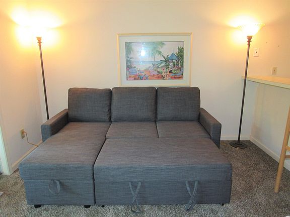 One Bedroom/One Bath unit on the second floor (top floor) with high cathedral/vaulted ceilings that provide a spacious feeling. You will not have anyone above you in this 2-story building. Bedroom also has cathedral/vaulted ceiling. Both sofas in the living room are sleeper sofas. The blue sofa also has storage area for your pillows and blankets. Washer and dryer are in the bathroom closet. New carpeting just done in June 2021, freshly painted, new refrigerator in 2020 and water heater is only about 4 years old. Home Warranty for new buyer. Access to the screened porch from sliding glass doors in the living room. You are just across from the swimming pool. This unit can be rented short term to vacation renters or to long term annual tenants. These units are ideal for a vacation retreat, second home or to generate rental income. Close to everything-shopping, restaurants, schools, beach and entertainment.
