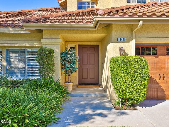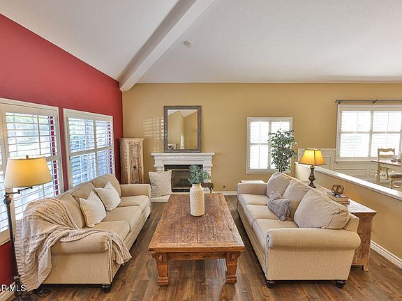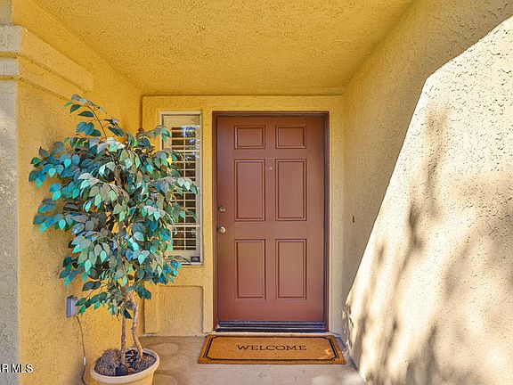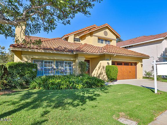 Welcome home to this lovely 3 bedroom, 2.5 bathroom, almost 2,500 sqft home located in desirable South Moorpark! Fantastic curb appeal with bright greenery and a custom garage door that coordinates perfectly with the tile roof. Step inside to find an open and airy floorplan with high ceilings and a wonderful flow. The formal living room features wood like flooring, and the formal dining room connects directly to the kitchen with plenty of space for a large table. Flow through to the family room which is wrapped in windows and features a cozy fireplace as a centerpiece. The adjacent eat in kitchen has loads of cabinet space, a nice sized center island, tile countertops, and stainless steel appliances. Also found downstairs is a laundry room and powder bath! Upstairs you will find the bedrooms, starting with a huge master that features an attached ensuite with dual vanities, large soaking tub, and glass enclosed shower. The secondary Jack and Jill bedrooms are good sized with plush carpeting and connect via the hall bath with a tub/shower combo. The backyard is huge and private, with a large covered patio that offers plenty of space for a table and bbq. The expansive grassy area includes ample room to play! The entire yard is nicely landscaped and wrapped in greenery, providing the perfect space to relax and unwind. The community includes access to a pool and spa. Close to excellent schools, parks, shops, and restaurants. This is the one you've been waiting for! Welcome home!