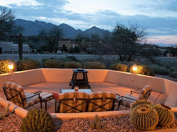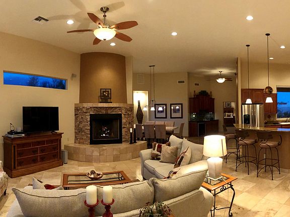 Meticulously maintained home in desirable Moonridge Estates in Oro Valley. Situated on .53 acres this magnificent split bedroom floor plan boasts towering ceilings, and a spacious cozy great room including the living room, dining room & gourmet kitchen. Thoughtfully placed windows frame views of Pusch Ridge, Tortolita Mtns, and dazzling Arizona sunrise/sunsets creating a bright & inviting space. Features include: Granite countertops, 18-inch travertine tile, 12ft ceilings, knotty pine wood doors, ceiling fans in every room, wet bar, recessed lighting, and custom gas fireplace with petrified wood inlays.The outdoor living space includes covered patios around the house so you can always find the shade or sun, depending on the time of year. Outdoor highlights: covered patio with planked... ...wood ceilings, flagstone, gas fireplace, gas fire pit with seating area, electric sun shades, ceiling fans, in-ground hot tub, easy care Xeriscape landscaping, and BBQ with built-in seating area.