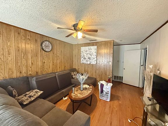 The inviting living room features wood-paneled walls that add warmth and character, along with vinyl plank flooring for a modern touch. The kitchen and bathrooms also feature vinyl plank flooring for easy maintenance, while the bedrooms are carpeted for added comfort.