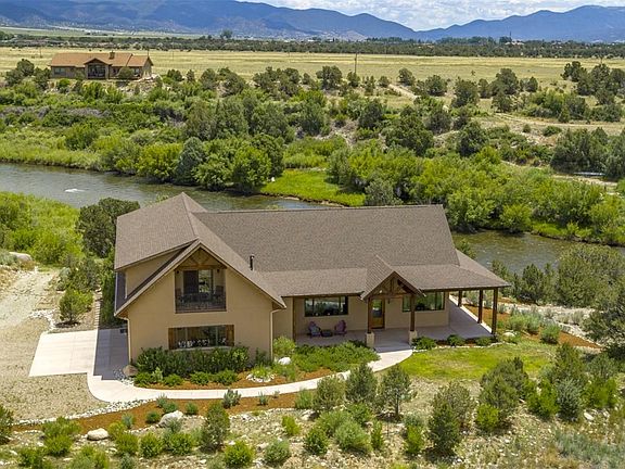 Salida, Colorado riverfront home for sale. 4.9 acres with approximately 320 feet of Arkansas River frontage. 3,311SF custom home built in 2017. 3 Bedrooms, 3 Full Bathrooms, 1 half bath. Large storage/bonus room could be converted to a bedroom, office, media room, etc. Attached 2 car garage and large detached shop. Located in one of the valley's premier riverfront locations, meaning far away from the sound and view of the highway, yet only 10 minutes from downtown Salida, 25 minutes to Buena Vista, and 30 minutes to Monarch Ski Area. A true custom home constructed with the highest quality materials and attention to detail. Open floor plan, spacious rooms, bright natural light and views in every direction. River views and sounds from the main level master suite, dining and living areas, and wrap around patio. Mountain views out every window and in every direction. Upper level features a nice sitting area, a large bonus/storage room and two massive bedrooms with en suite bathrooms and private balconies. In addition to the two car attached garage there is a 2,318SF shop with 3 full bays, a large studio, an attached greenhouse, and a carport. Plenty of room for boats, rafts, UTV's, campers, jeeps, you name it. The river's edge is only steps away or you can drive right down to your own private launch ramp and drop in for a quick float to town. The river is calm and provides a nice place for launching, retrieving, fishing, or just wading in to cool off. Home is on the grid but operates primarily off solar which reduces utility bills and provides peace of mind. In floor radiant hot water heat, well and septic, and Starlink internet system included.