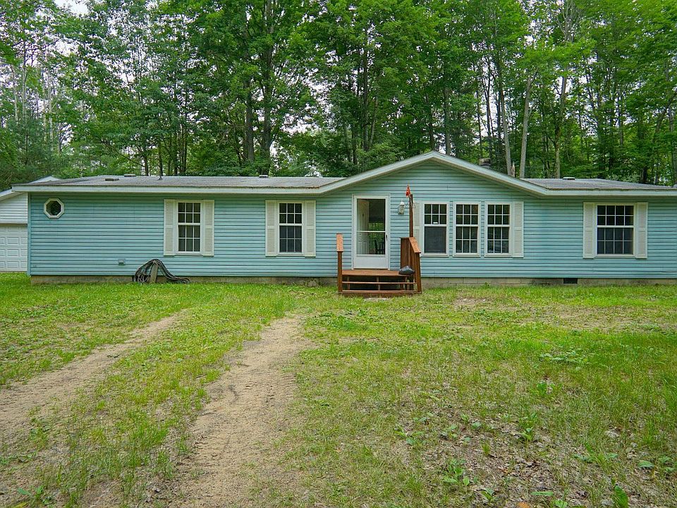 Charming four-bedroom, two-bath manufactured home nestled on 10 scenic acres just 3 miles southeast of Fife Lake at the end of Mueller Road. Built in 1996, this 1600 sq ft home boasts an open floor plan with a sunroom adjoining the spacious master bathroom and well as a beautiful fireplace in the living room. Stay cozy with an outdoor wood boiler heating the home, garage, and water. The large garage is insulated and heated, a huge bonus in northern Michigan. Enjoy the serene landscape featuring hardwoods, softwoods, evergreens, and a tranquil creek meandering through the property—perfect for outdoor enthusiasts and hunters alike, with ample space for a hunting blind.