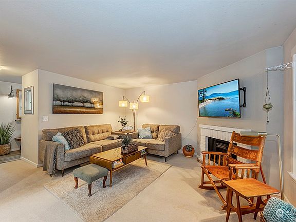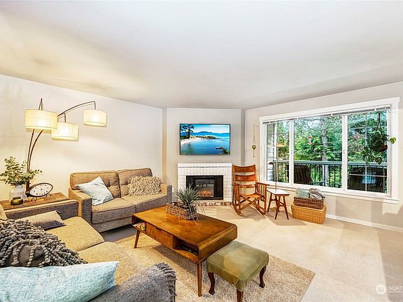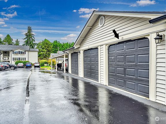 Gated entrance middle floor end unit rambler style condo w/3-bedroom 2 full bath detached garage & carport parking included. This condo is in a private location that backs to greenbelt and has nice entry w/laminate flooring, painted millwork & designer colors, open floor plan w/brick fireplace & electric insert, greenbelt view family & dining area, updated kitchen w/stainless appliances & sitting bar, led lighting, dining room, secluded walk out deck w/storage, good sized bedrooms, primary bedroom has primary bathroom & walk in closet, updated bathrooms, full sized washer/dryer included. Popular complex has gorgeous clubhouse cabana w/pool, kitchen, & oversized exercise gym. Pets are ok, & lots of guest parking.