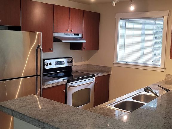 Super clean top floor condo! Pride of ownership shows throughout. Vaulted ceilings for a feeling of space and comfort. Open floor plan for ease of living. Cozy wood burning fireplace in the spacious living room. Very warm and inviting with three large bedrooms and two full bathrooms. Kitchen features stainless steel appliances, granite counter tops with breakfast bar. Separate dining room. End unit for added privacy. Covered deck with added storage. Secured and gated community. Close to the clubhouse, exercise room, game room, sport court and outside pool. Very convenient location. Two assigned parking spaces with one covered! Close to I-5, I-405 and Evergreen Way. A very nice, extremely well run community. Come and see!