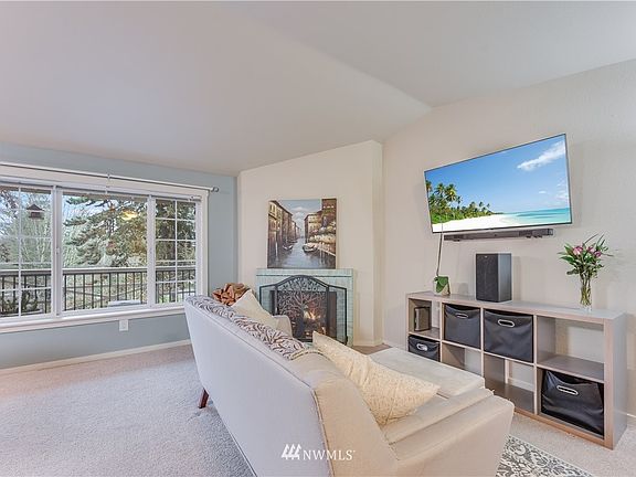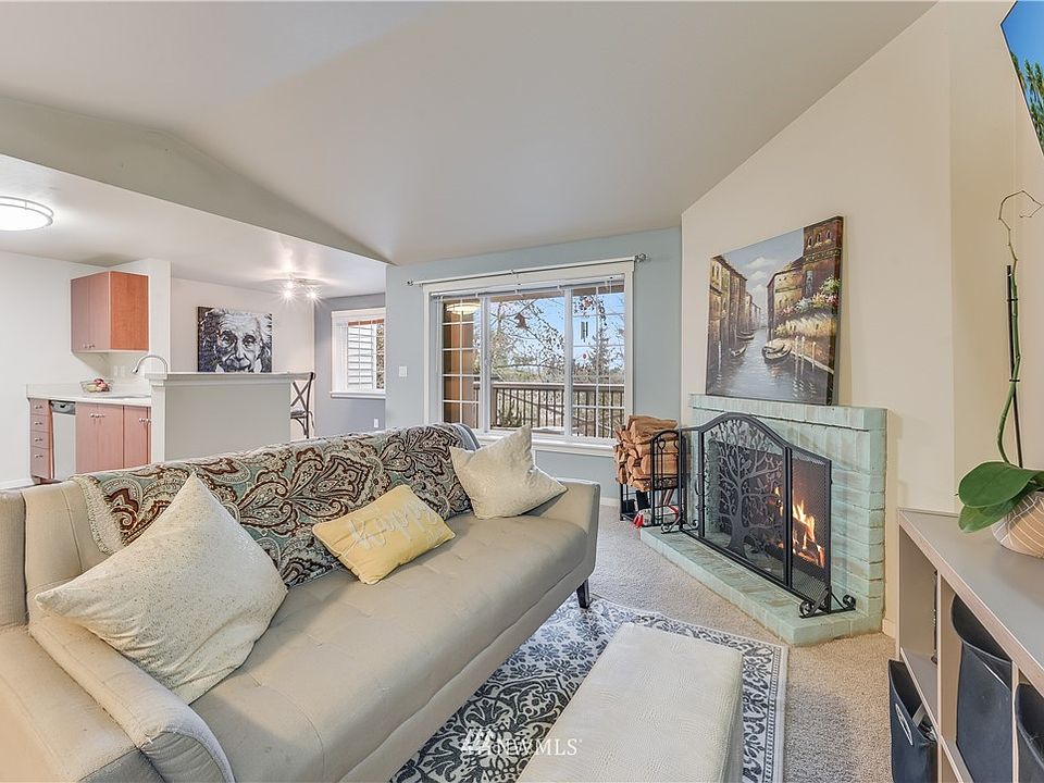 Move in Ready! This top floor two bedroom 1 bath condo is located in the Bluegrass gated community. Just steps away to your front door that leads you into a bright, cozy, and open living space. Vaulted ceilings & wood fp in the living room. Large windows provides ample of natural light. Nice open kit w/SS appliances & eating bar. Private, covered patio w/storage. Primary bedroom w/walkin closet and direct access into the full bath. New carpet,new flooring in kitchen & bath. 1yr new washer & hot water tank. All appliances stay. Comes w/1 assigned carport & single garage; both conveniently located in front of your condo. Strong HOA. Great amenities: outdoor pool, clubhouse, & exercise room. Close to transit & easy access to the freeway.