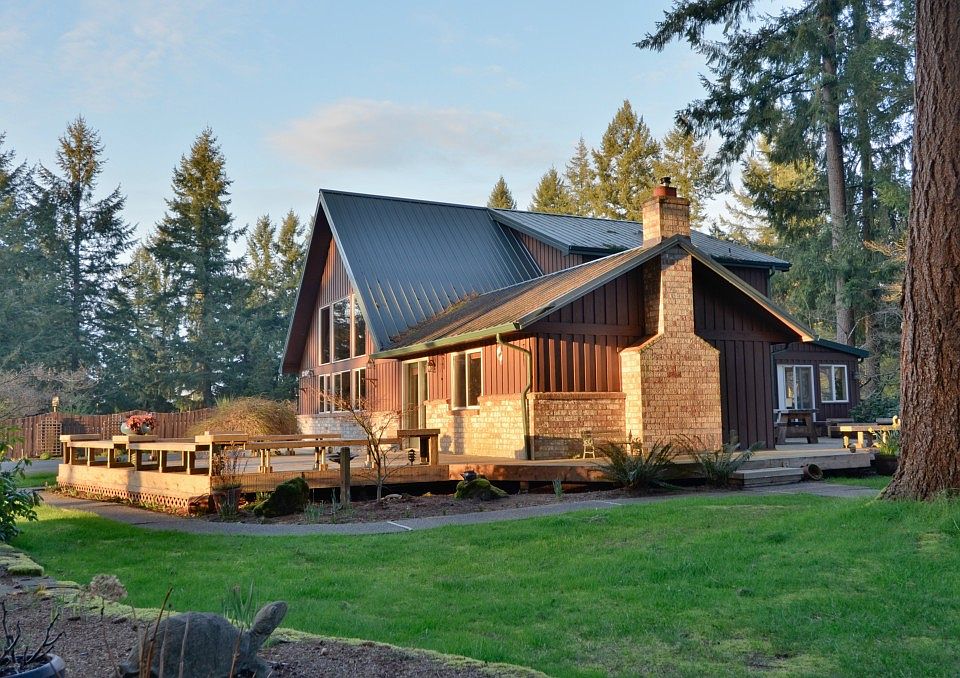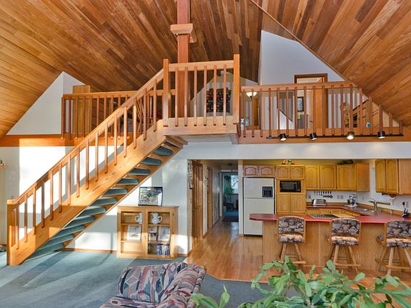 Welcome to the country! Quiet home sits on 5+ acres. Kitchen opens to living/dining room. Gorgeous floor to ceiling windows allow for maximum light. Cedar ceilings and 2 fireplaces gives a cozy feeling. Family room, sun room & utility room too. Wrap-around deck is large enough for gatherings. Two massive shops: back shop has 2 horse stalls with fully fenced pasture area, front shop has separate bathroom & office. 11 covered parking spaces provide plenty of room for all your toys. Welcome Home!