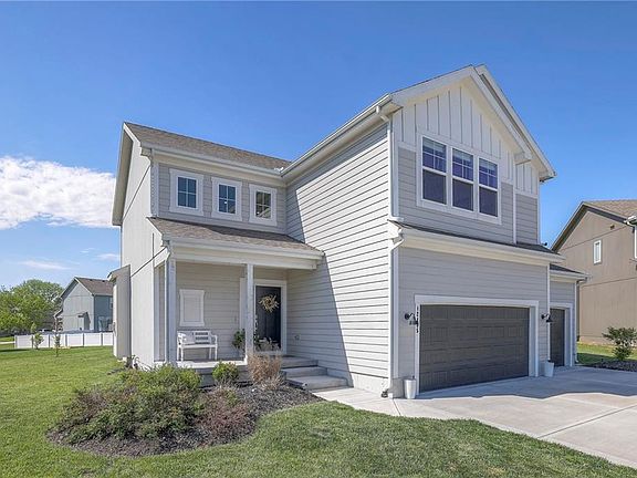 Adorable, LIKE NEW home on one of the largest cul-de-sac lots in the neighborhood! You'll notice the open floor plan and tall ceilings upon entering the home. The main level features bright white kitchen cabinets with a subway tile backsplash and gorgeous granite countertops. Light grain wood floors are throughout the main level and flow into the large living room with gas fireplace. There's a place for all of the backpacks, coats and shoes in the mudroom as you come in from the garage, plus convenient half bath on main level. Don't miss the giant, walk-in pantry for all your kitchen storage needs! Upstairs you'll find four generously sized bedrooms, a laundry room and full bathroom in the hallway. The large primary bedroom with ensuite bathroom is a great escape at the end of the day. Huge walk-in closet with plenty of built-in shelving. Primary bathroom features tile floors, double vanities, granite countertops and large walk-in shower. Unfinished basement with option for 5th bedroom and another full bath. Raymore-Peculiar Schools!
