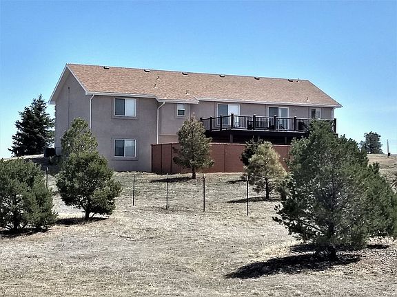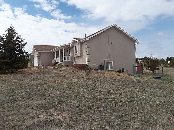 Excellent property located in desirable Latigo Trails subdivision, five miles north of the growing Falcon area (School District 49). 4-bedroom, 3 ½ bath stucco ranch home with walk-out on both levels, centered on 2.6 treed acres. 3,085 sq ft total on two levels (2,854 finished). Open-concept main level with spacious living, dining room and kitchen area. 20 x 14 Family Room on lower level with gas fireplace. Remodeled master bath. Attached two-vehicle oversize garage with workbench and overhead storage. 16 x 20 back deck with yard access. Half-acre fenced backyard and patio with hot tub connection and attractive concrete privacy wall. Detached 20 x 30 metal shed in back of property, easily converted to multiple purposes. Central air conditioning system, natural gas furnace, water softener. Well and septic. Great neighborhood, zoned for horses, five minute walk from the Latigo Trails Equestrian Center. Easy access to U.S. Hwy 24 and Colorado Springs