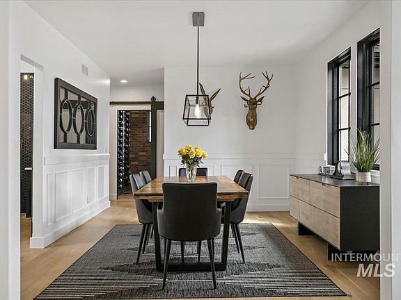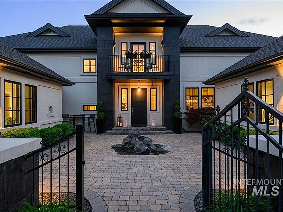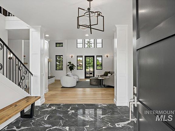 Experience luxury at this stunning estate and uncover a welcoming community nestled in the Boise foothills. Engage in the natural beauty with conservation areas, vast green spaces, parks, numerous trails, and outdoor activities, all while being conveniently located near downtown Boise and Eagle (just a 15-minute drive to both) and Hwy 55 for mountain and river access. This home offers 5,930 square feet of luxurious living space, featuring an open-concept great room, custom built-ins, a remarkable fireplace, two spacious primary suites with private bathrooms, a guest bedroom with an en suite, a fourth bedroom or versatile space, a divided four-car garage with storage, epoxy floors, a family/game room, wine room, and a private gym. The interior showcases exquisite craftsmanship with detailed millwork, marble/Italian tile, white oak hardwood floors, and Pella windows. The chef's kitchen includes an 11-foot quartz island, granite countertops, two ovens, a six-burner gas cooktop, an acacia butcher block counter